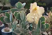 唐印为景天科伽蓝菜属的多年生肉质草本植物。植株中型,株高50厘米,宽20厘米,多分枝;叶片肉质,对生,卵形,全缘,先端钝圆,叶片淡绿色至灰绿色,表面被有厚厚的白粉,光照充足时,叶缘呈红色;圆锥花序,…全部>>
