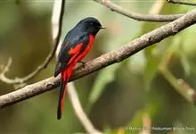 灰喉山椒鸟:共有8个亚种。体长18-22厘米。雄鸟头部和背亮黑色,腰、尾上覆羽和下体朱红色,翅黑色具一大一小的两道朱红色翼斑。中央尾羽黑色,外侧尾羽基部黑色,端部红色。…全部>>