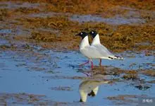 黑嘴鸥 中型水鸟,体长31~39厘米。嘴黑色,脚红色。夏羽头黑色,眼上和眼 下具白色星月形斑,在黑色的头上极为醒目。颈、腰、尾上覆羽、尾和下体白色。初级飞羽末端具黑色斑点。翼下仅部分初级飞羽黑色,与…全部>>