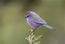 凤头雀莺:小型鸟类。体长9-10厘米,雄鸟呈毛茸茸的紫色和绛紫色,顶冠淡紫灰色,额及凤头白色,尾全蓝。雌鸟喉及上胸白,至臀部渐变成淡紫色,耳羽灰,…全部>>