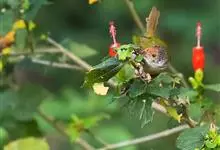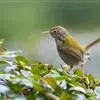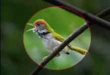 普通缝叶莺,是雀形目鹅科莺亚科缝叶莺属一种。体长10-14厘米,体重7-10克,雄鸟前额棕红,头顶至枕棕橄榄褐,上体橄榄绿染黄,飞羽及尾羽暗褐;繁殖期雄鸟的中央尾羽特形延长,下体淡皮黄白色。…全部>>