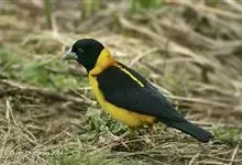 黄颈拟蜡嘴雀:小型鸟类,体长20-22厘米。嘴粗大,黑色。雄鸟整个头、颈、颏、喉和上胸辉黑色,两翅和尾亦为黑色,其余上体橙黄色,下体鲜黄色。雌鸟头、颈、颏、喉和上胸中央灰色或暗灰色,…全部>>