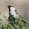 黑顶麻雀:为雀科麻雀属的鸟类。体重24-35克,体长144-167毫米,是一种中等体型的麻雀。繁殖期雄鸟头顶有黑色的冠顶纹至颈背,眼纹及颏黑,眉纹及枕侧棕褐,脸颊浅灰。上体褐色而密布黑色纵纹。…全部>>