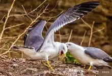 灰翅鸥,夏羽头、颈、腰、尾白色;肩、背和翅上覆羽鸽灰色。冬羽和夏羽相似,但头和颈具淡褐色纵纹,有时扩展至上胸。嘴黄色,下嘴先端具红斑;幼鸟嘴黑色。脚粉红色。栖息于海岸:悬岩,海滨沙滩于近海海岛上。常…全部>>