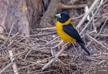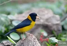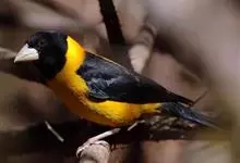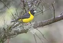 黄颈拟蜡嘴雀:小型鸟类,体长20-22厘米。嘴粗大,黑色。雄鸟整个头、颈、颏、喉和上胸辉黑色,两翅和尾亦为黑色,其余上体橙黄色,下体鲜黄色。雌鸟头、颈、颏、喉和上胸中央灰色或暗灰色,…全部>>