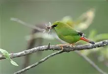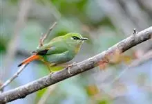 火尾绿鹛是莺科、绿鹛属小型鸟类,体长11-14厘米。上体绿色,头顶至枕具黑色鳞状斑,眼先和眼后黑色,眉纹黄绿色。两翅黑色具黄色和红色翅斑及白色端斑,极为醒目。中央一对尾羽绿色,外侧尾羽鲜红色。…全部>>