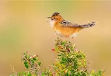 金头扇尾莺体小而具褐色纵纹的莺。嘴细长,略向下弯;翼短,体型娇小,尾长。下体皮黄,喉近白,尾深褐,尾端皮黄。雌雄羽色相近,羽色单调。繁殖期雄鸟顶冠亮金色,腰褐色。雌鸟及非繁殖期雄鸟头顶密布黑色细纹,…全部>>
