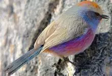 凤头雀莺:小型鸟类。体长9-10厘米,雄鸟呈毛茸茸的紫色和绛紫色,顶冠淡紫灰色,额及凤头白色,尾全蓝。雌鸟喉及上胸白,至臀部渐变成淡紫色,耳羽灰,…全部>>