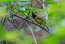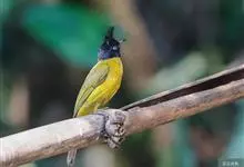 黑冠黄鹎:体长18-21厘米,是一种中等体型偏黄色鹎。整个头、颈、颏、喉黑色,头顶有显著直立的羽冠,黑色,上体褐橄榄黄绿色,下体橄榄黄色。虹膜偏红;嘴及脚黑色。…全部>>