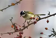 黑头鹎:体长17厘米。是一种中等体型的偏黄色鹎。特征为头辉黑、喉黑而眼蓝。上体黄橄榄色;两翼及尾偏黑,具明显的黄色尾端;下体绿黄色。另一罕见色型为灰色,尾缘白色。与黑冠黄鹎的区别在无羽冠且尾端黄色。…全部>>