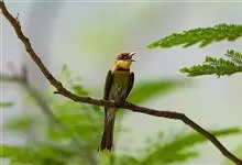 黄喉蜂虎属中型鸟类,体长23-30厘米。喉黄色,其下有一窄的黑色胸带;胸带以下的整个下体蓝绿色。前额蓝白色,具一宽的黑色贯眼纹,头顶至后颈暗栗色,尾蓝绿色,中央尾羽延长,明显突出于其他尾羽。…全部>>