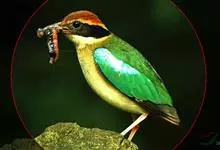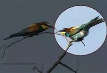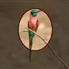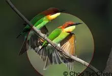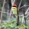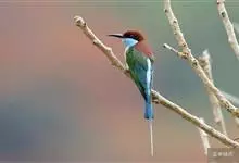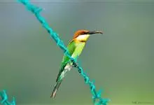 栗喉蜂虎是蜂虎科蜂虎属的鸟类。有热带鸟类羽毛艳丽的特征:喉部是栗红色的,黑色的过眼纹,翅膀和背部是绿色的,尾翼是蓝色的,飞行时翅膀下面的羽毛是橙黄色的,在阳光的照射下,它们全身闪烁着金属般的艳丽光泽,…全部>>