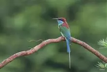 蓝喉蜂是蜂虎科蜂虎属鸟类。体长26-28厘米,嘴长而弯曲,有明显细长的中央尾羽。头部、颈部和背部为巧克力色,有黑色眼纹。喉部、腰部和尾羽为蓝色。腹部和两翼为绿色。幼鸟外观似成鸟,头部、颈部和背部为绿色,…全部>>