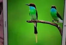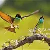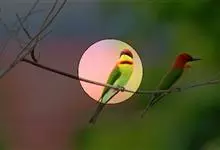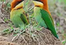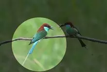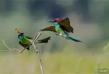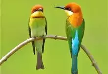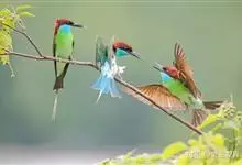 栗喉蜂虎是蜂虎科蜂虎属的鸟类。有热带鸟类羽毛艳丽的特征:喉部是栗红色的,黑色的过眼纹,翅膀和背部是绿色的,尾翼是蓝色的,飞行时翅膀下面的羽毛是橙黄色的,在阳光的照射下,它们全身闪烁着金属般的艳丽光泽,…全部>>