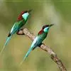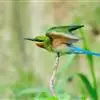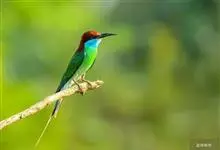 绿喉蜂虎是佛法僧目、蜂虎科的小型鸟类,共有9个亚种。身长22-25厘米,翼展29-30厘米,体重15-20克。喉绿色,额部、头顶至上背为锈红色,其余上体均为亮绿色。中央尾羽延长且端段狭细,…全部>>