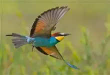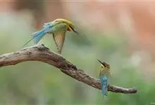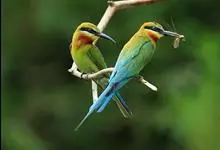 蓝喉蜂是蜂虎科蜂虎属鸟类。体长26-28厘米,嘴长而弯曲,有明显细长的中央尾羽。头部、颈部和背部为巧克力色,有黑色眼纹。喉部、腰部和尾羽为蓝色。腹部和两翼为绿色。幼鸟外观似成鸟,头部、颈部和背部为绿色,…全部>>