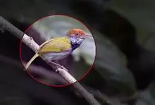 棕脸鹟莺:体长10厘米,是一种色彩亮丽而有特色的莺鸟。头栗色,具黑色侧冠纹。上体绿,腰黄色。下体白,颏及喉杂黑色点斑,上胸沾黄。与栗头鹟莺的区别在头侧栗色,白色眼圈不显著且无翼斑。…全部>>