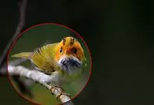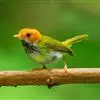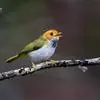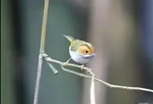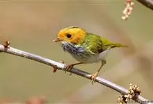 棕脸鹟莺:体长10厘米,是一种色彩亮丽而有特色的莺鸟。头栗色,具黑色侧冠纹。上体绿,腰黄色。下体白,颏及喉杂黑色点斑,上胸沾黄。与栗头鹟莺的区别在头侧栗色,白色眼圈不显著且无翼斑。…全部>>