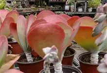 唐印为景天科伽蓝菜属的多年生肉质草本植物。植株中型,株高50厘米,宽20厘米,多分枝;叶片肉质,对生,卵形,全缘,先端钝圆,叶片淡绿色至灰绿色,表面被有厚厚的白粉,光照充足时,叶缘呈红色;圆锥花序,…全部>>