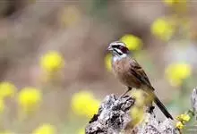 黄眉鹀是雀形目鹀科鹀属鸟类,体型中等偏小。雄鸟头部主要为黑色,冠纹白色,眉纹前段黄色而后段白色,喉白而具黑色细碎纵纹;上体主要为栗褐色,背具黑褐色纵纹;翼主要为黑褐色,…全部>>