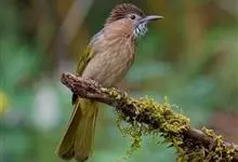 绿翅短脚鹎是鹎科、短脚鹎属的鸟类。共有9个亚种。中型鸟类,体长20-26厘米。头顶羽毛形尖、栗褐色具白色羽轴纹,在暗色的头部极为醒目。上体灰褐缀橄榄绿色,两翅和尾亮橄榄绿色。耳和颈侧红棕色,颏、喉灰色,…全部>>