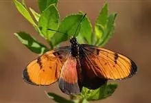虎斑蝶,Danaus genutia ,是斑蝶属的一种,常见于湿地公园内。雄性虎斑蝶经常伏于吊裙草 上吸食汁液,以制造吸引异性的香气。虎斑蝶翅膀腹面鲜橙色,翅脉和翅边缘黑色,边缘上有两行小白点,…全部>>