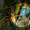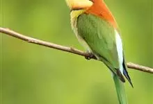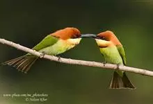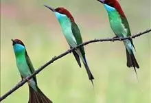 栗喉蜂虎是蜂虎科蜂虎属的鸟类。有热带鸟类羽毛艳丽的特征:喉部是栗红色的,黑色的过眼纹,翅膀和背部是绿色的,尾翼是蓝色的,飞行时翅膀下面的羽毛是橙黄色的,在阳光的照射下,它们全身闪烁着金属般的艳丽光泽,…全部>>