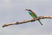 蓝喉蜂是蜂虎科蜂虎属鸟类。体长26-28厘米,嘴长而弯曲,有明显细长的中央尾羽。头部、颈部和背部为巧克力色,有黑色眼纹。喉部、腰部和尾羽为蓝色。腹部和两翼为绿色。幼鸟外观似成鸟,头部、颈部和背部为绿色,…全部>>