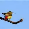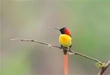 叉尾太阳鸟,雀形目太阳鸟科太阳鸟属留鸟;为小型鸟类,雄鸟头顶辉蓝绿色,上体橄榄绿色,腰明黄色,中央尾羽亮翠蓝色,羽轴针状延长,外侧尾羽黑色具白色端斑,头侧黑色,颜、喉和胸为绛红色,…全部>>