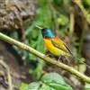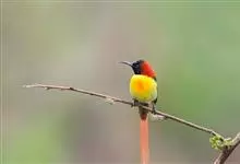 绿喉太阳鸟:共有9个亚种。小型鸟类,雄鸟体长13-15厘米、雌鸟10-12厘米。雄鸟前额至后颈、颏和喉辉绿色,头侧黑色,颈侧和背暗红色,两肩、下背橄榄绿色,腰鲜黄色,尾上覆羽和中央尾羽暗绿色,…全部>>