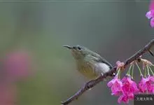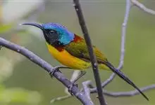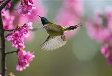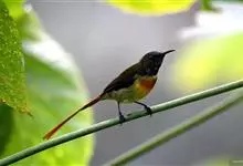 黑胸太阳鸟:小型鸟类,体长9-15厘米。嘴细长而向下曲。雄鸟中央尾羽特长,尾呈楔形,头顶至后颈紫蓝色具金属光泽;背褐红色,腰有一黄色横带,尾上覆羽和尾紫蓝色;颏、喉和上胸乌黑色,有的下胸为硫黄色,…全部>>