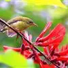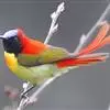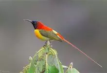 火尾太阳鸟为太阳鸟科太阳鸟属的鸟类。体长20厘米,色彩艳丽。雄鸟红色,具形长的艳猩红色中央尾羽。头顶金属蓝色,眼先和头侧黑色,喉及髭纹金属紫色。下体黄色,胸具艳丽的橘黄色块斑。雌鸟灰橄榄色,腰黄,…全部>>