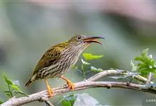 纹背捕蛛鸟:为太阳鸟科捕蛛鸟属的鸟类。是太阳鸟科中体型较大的一种,体重25-45克,体长160-210毫米。嘴粗长而尖且向下弯曲。上体橄榄黄色具黑色中央斑纹。下体淡黄白色满布黑色纵纹,尾具黑色次端斑。…全部>>