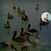 褐鹈鹕:是鹈鹕家族中体型最小的成员。体型粗大,体重6.5-9千克。嘴形宽大直长,上嘴尖端朝下弯曲,呈钩状;下嘴分左右二支,其间有一巨大而能扩缩的皮肤喉囊;鼻孔小,而位于嘴基。眼前部裸出。颈长而较细小…全部>>