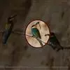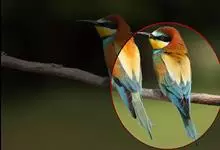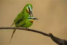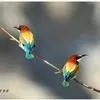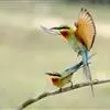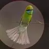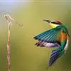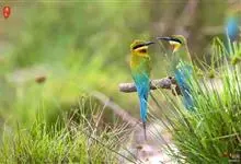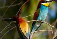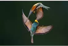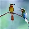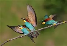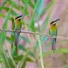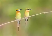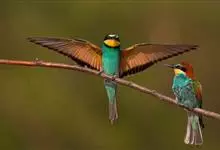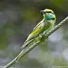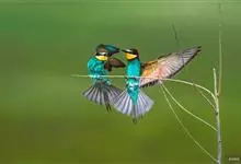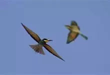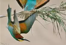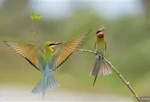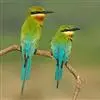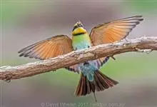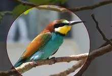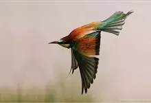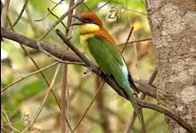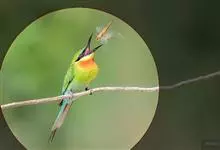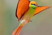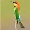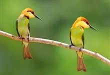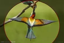 栗喉蜂虎是蜂虎科蜂虎属的鸟类。有热带鸟类羽毛艳丽的特征:喉部是栗红色的,黑色的过眼纹,翅膀和背部是绿色的,尾翼是蓝色的,飞行时翅膀下面的羽毛是橙黄色的,在阳光的照射下,它们全身闪烁着金属般的艳丽光泽,…全部>>
