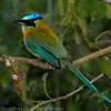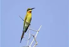 黄喉蜂虎属中型鸟类,体长23-30厘米。喉黄色,其下有一窄的黑色胸带;胸带以下的整个下体蓝绿色。前额蓝白色,具一宽的黑色贯眼纹,头顶至后颈暗栗色,尾蓝绿色,中央尾羽延长,明显突出于其他尾羽。…全部>>