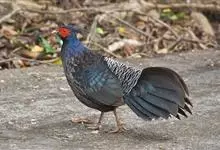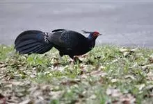 黑鹇是鸡形目雉科目鹇属鸟类,又称鸬雉、黑鸡。体型中等。雄鸟上体黑褐色,背羽具黑紫色金属光泽;头顶具黑羽冠;脸部裸皮呈红色,散生稀疏黑色纤羽;尾长而侧扁,中央两对尾羽红褐色,…全部>>