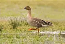 灰雁:体长70-90厘米,翼展147-182厘米,体重2.5-4千克,寿命17年。体大而肥胖。嘴、脚肉色,上体灰褐色,下体污白色,飞行时双翼拍打用力,振翅频率高。脖子较长。腿位于身体的中心支点,…全部>>