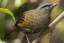 蓝翅噪鹛:噪鹛科、彩翼噪鹛属动物。中型鸟类,体长22-25厘米。上体棕橄榄褐色密被黑色鳞状斑,眼蓝白色,眼上有一长而宽阔的黑色眉纹,从眼先直到颈侧。下体棕褐色被黑色鳞状斑;尾上和尾上覆羽栗色,…全部>>