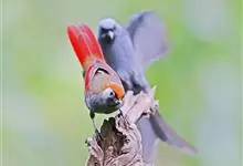 赤尾噪鹛中型鸟类,体长24~28厘米。头顶至后颈红棕色,两翅和尾鲜红色,眼先、眉纹、颊、颏和喉黑色,眼后有一灰色块斑。其余上下体羽大都暗灰或橄榄灰色。特征极明显,特别是通过鲜红色的头顶、翅和尾。…全部>>