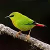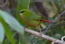 火尾绿鹛是莺科、绿鹛属小型鸟类,体长11-14厘米。上体绿色,头顶至枕具黑色鳞状斑,眼先和眼后黑色,眉纹黄绿色。两翅黑色具黄色和红色翅斑及白色端斑,极为醒目。中央一对尾羽绿色,外侧尾羽鲜红色。…全部>>