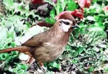 白颊噪鹛是雀形目噪鹛科噪鹛属鸟类,又称土画眉、小画眉、小噪鹃。成鸟额至头顶栗褐色,长眉纹、眼先和颊纹棕白色,眼后至耳羽深褐色,…全部>>