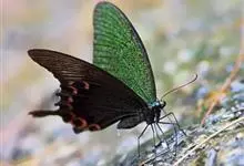 绿带翠凤蝶,又名深山凤蝶,为凤蝶科凤蝶属下的一种。分布于韩国、日本、中国台湾、中国大陆等地。翅黑色,满布金绿色鳞片。前翅亚缘具黄绿色横带纹。后翅外缘有6个略呈新月形的红斑,…全部>>