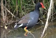 黑水鸡:是鹤形目、秧鸡科的鸟类,共有12个亚种。中型涉禽,体长24-35厘米。嘴长度适中,鼻孔狭长;头具额甲,后缘圆钝;嘴和额甲色彩鲜艳。翅圆形,第2枚初级飞羽最长,或第2枚和第3枚初级飞羽等长,…全部>>