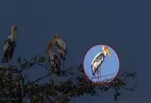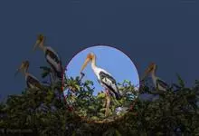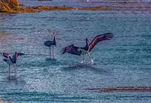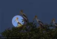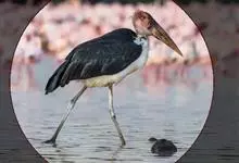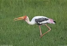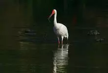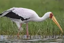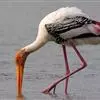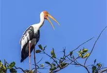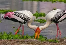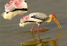 彩鹳:鹳科、鹮鹳属的鸟类。体长93-102厘米,体重2-3.5千克。橙黄色的嘴粗而长,但嘴尖稍微向下弯曲。脚为红色,也特别长,胫的下部裸出。橙色的头部赤裸无羽,繁殖期变为红色。体羽主要为黑色和白色,…全部>>