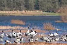 丹顶鹤:是鹤科、鹤属的一种大型涉禽,体长120-160厘米。颈、脚较长,通体大多白色,头顶鲜红色,喉和颈黑色,耳至头枕白色,脚黑色,站立时颈、尾部飞羽和脚黑色,头顶红色,…全部>>