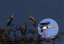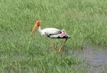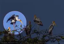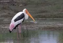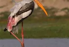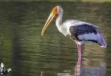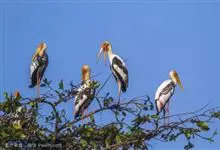 彩鹳:鹳科、鹮鹳属的鸟类。体长93-102厘米,体重2-3.5千克。橙黄色的嘴粗而长,但嘴尖稍微向下弯曲。脚为红色,也特别长,胫的下部裸出。橙色的头部赤裸无羽,繁殖期变为红色。体羽主要为黑色和白色,…全部>>
