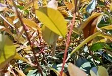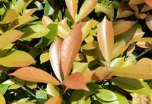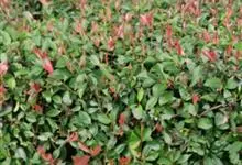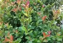 红叶石楠 是蔷薇科,石楠属杂交种,为常绿小乔木或灌木,乔木高可达5米、灌木高可达2米。叶片革质,长圆形至倒卵状、披针形,叶端渐尖,叶基楔形,叶缘有带腺的锯齿,花多而密,复伞房花序,花白色,梨果黄红色,…全部>>