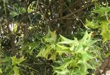 构骨叶冬青学名枸骨,又名猫儿刺、老虎刺、八角刺、鸟不宿、构骨、狗骨刺、猫儿香和老鼠树。常绿灌木或小乔木,高1-3米,二年枝褐色,三年生枝灰白色,叶片厚革质,花淡黄色,果球形,直径8-10毫米,成熟时…全部>>