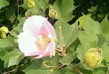 木芙蓉,锦葵科木槿属落叶灌木或小乔木。小枝上有细绒毛;叶片为卵状心形,托叶为披针形,常早落;花单生,花萼为钟形,花冠初为白色或淡红色,后逐渐变为深红色;果实为扁球形,有淡黄色的毛附着。花期8到10月。…全部>>